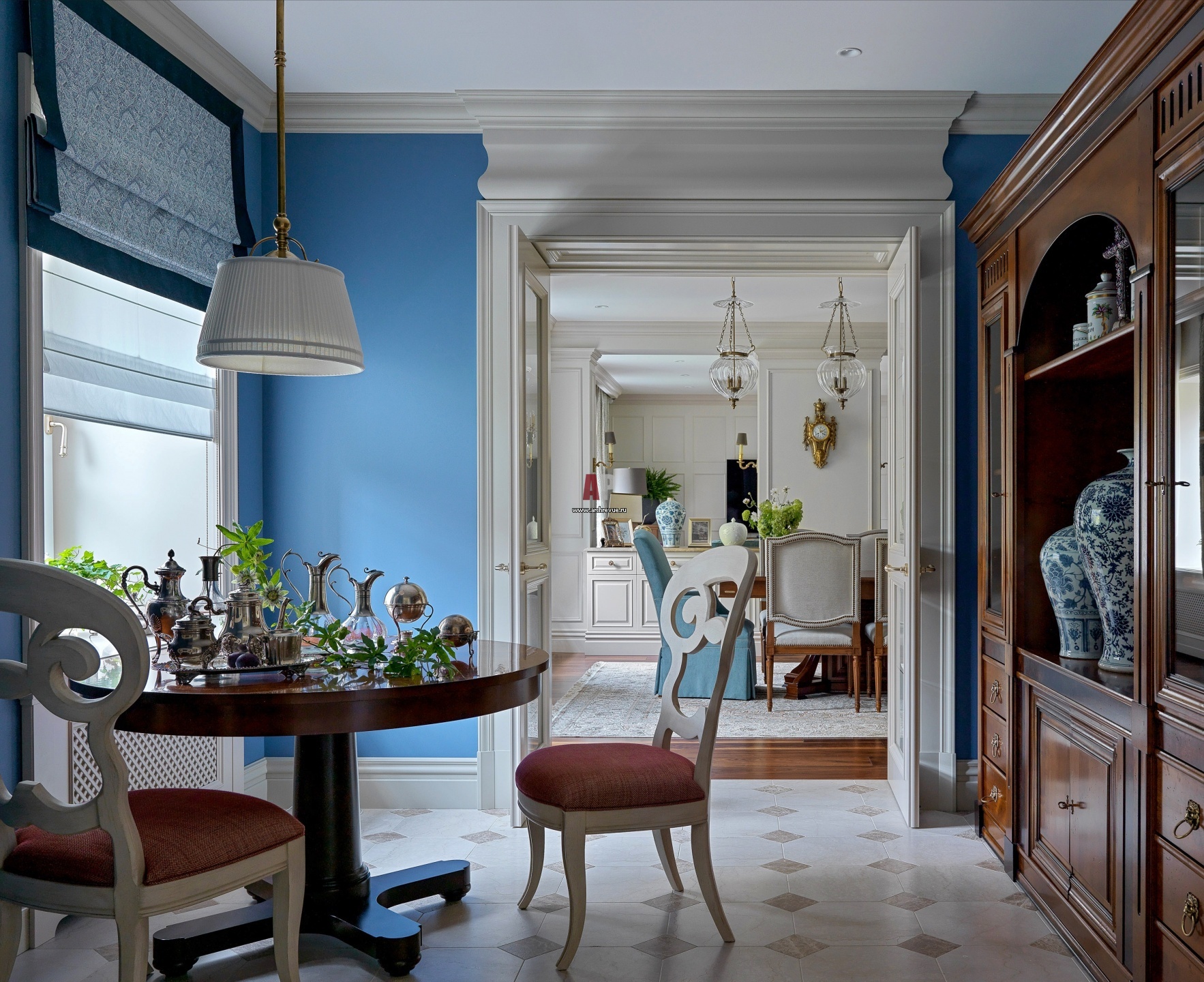 Между кухней и парадной столовой расположена чайная комната. Ее стены выкрашены в кобальтовый оттенок. Стол для завтраков, Hickory Chair. Стулья, Century Furniture. Люстра, Circa Lighting.