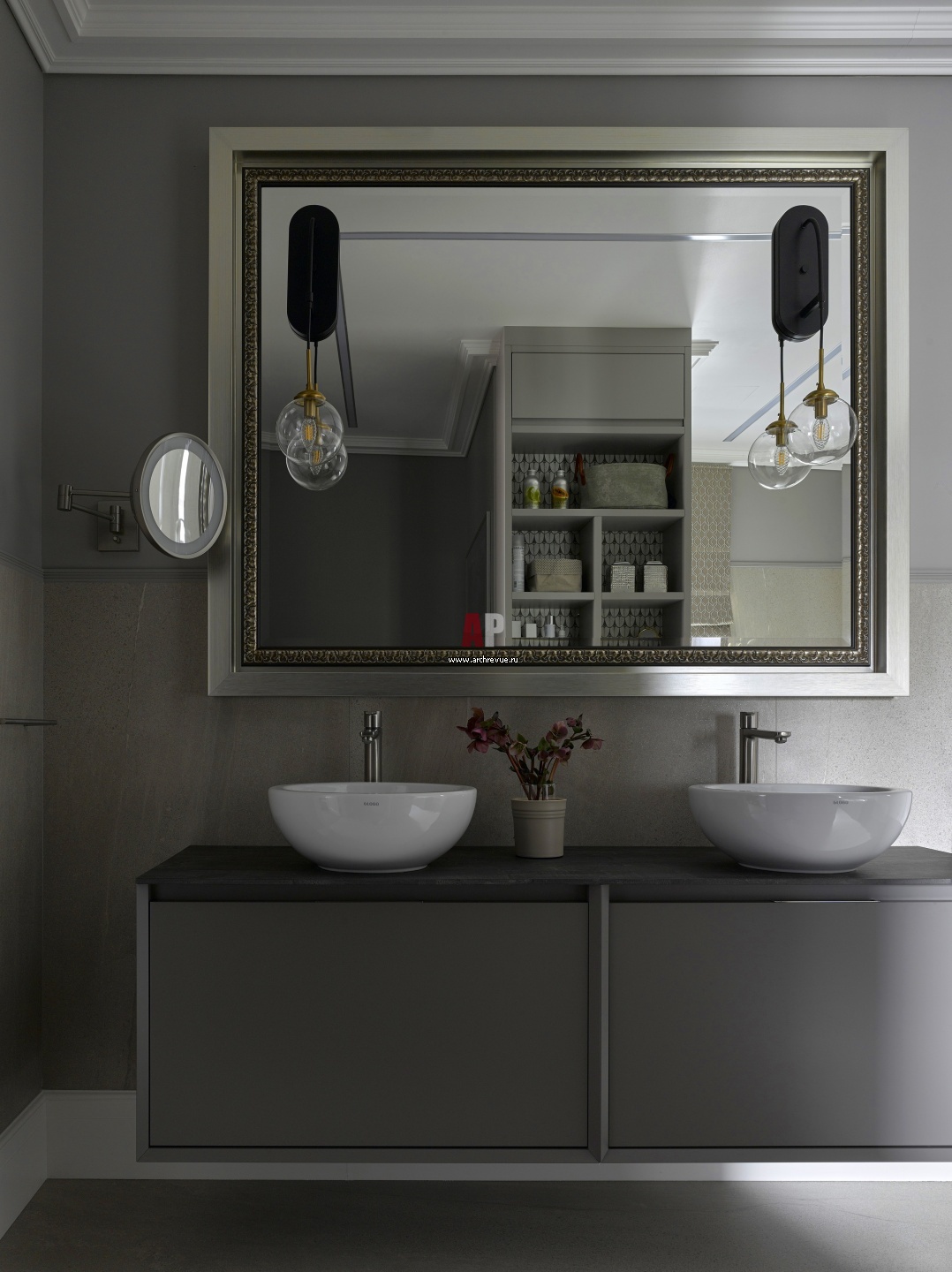 Хозяйская ванная комната. Парные накладные раковины, Globo. Тумба с гладкими однотонными фасадами. Бра, Savoy House.
