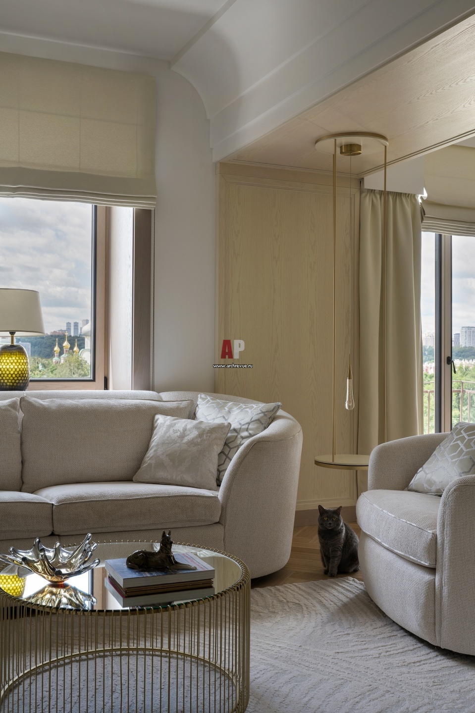 Подвесной столик из латуни эффектно маскирует технологическое понижение потолка. В коробе скрыта бетонная балка и инженерные коммуникации.