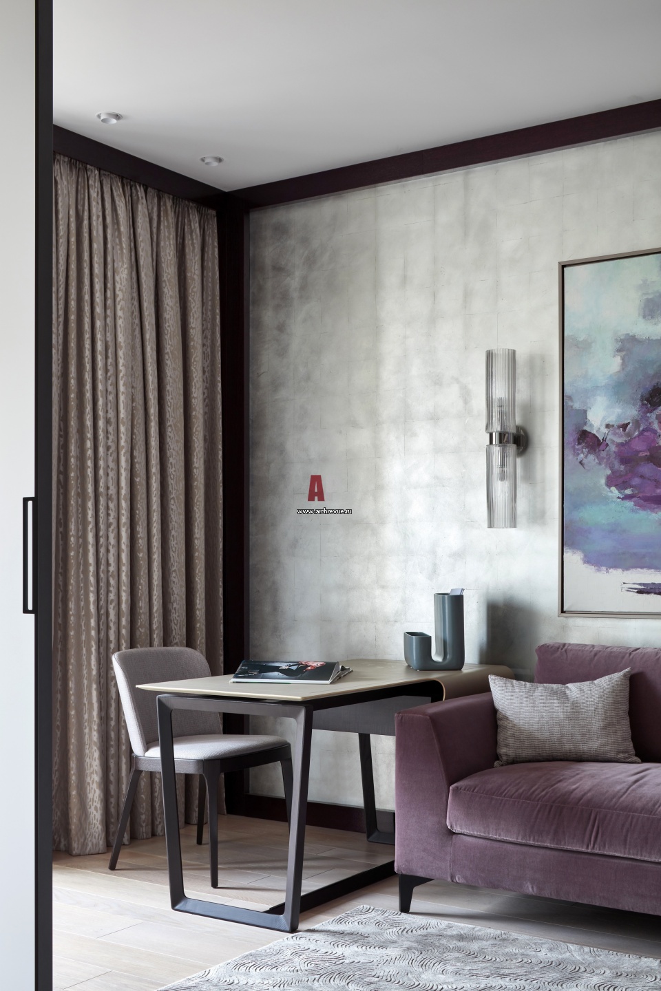 Кабинет хозяйки декорирован в серой гамме с лиловыми акцентами. Стена покрыта серебряной поталью. Письменный стол, Poltrona Frau. Стул, Cattelan Italia.