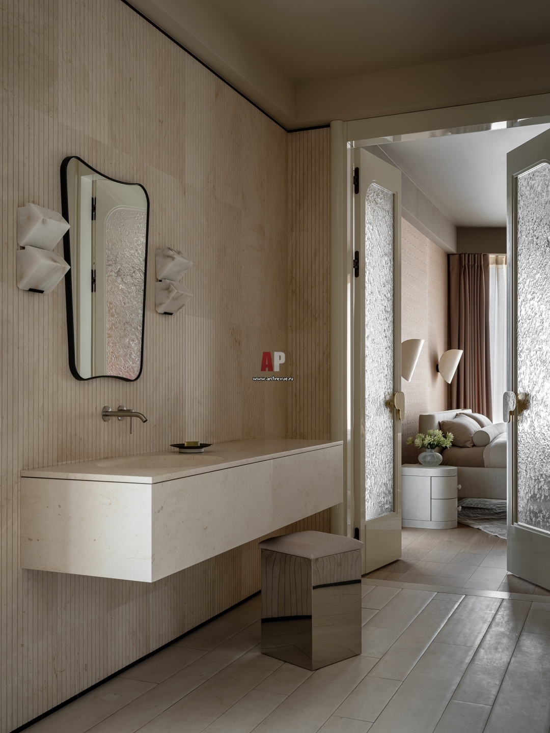 Женский интерьер с тактильными отделками и иконами мебельного дизайна. Ванная комната при спальне. Камень, Salvatori.