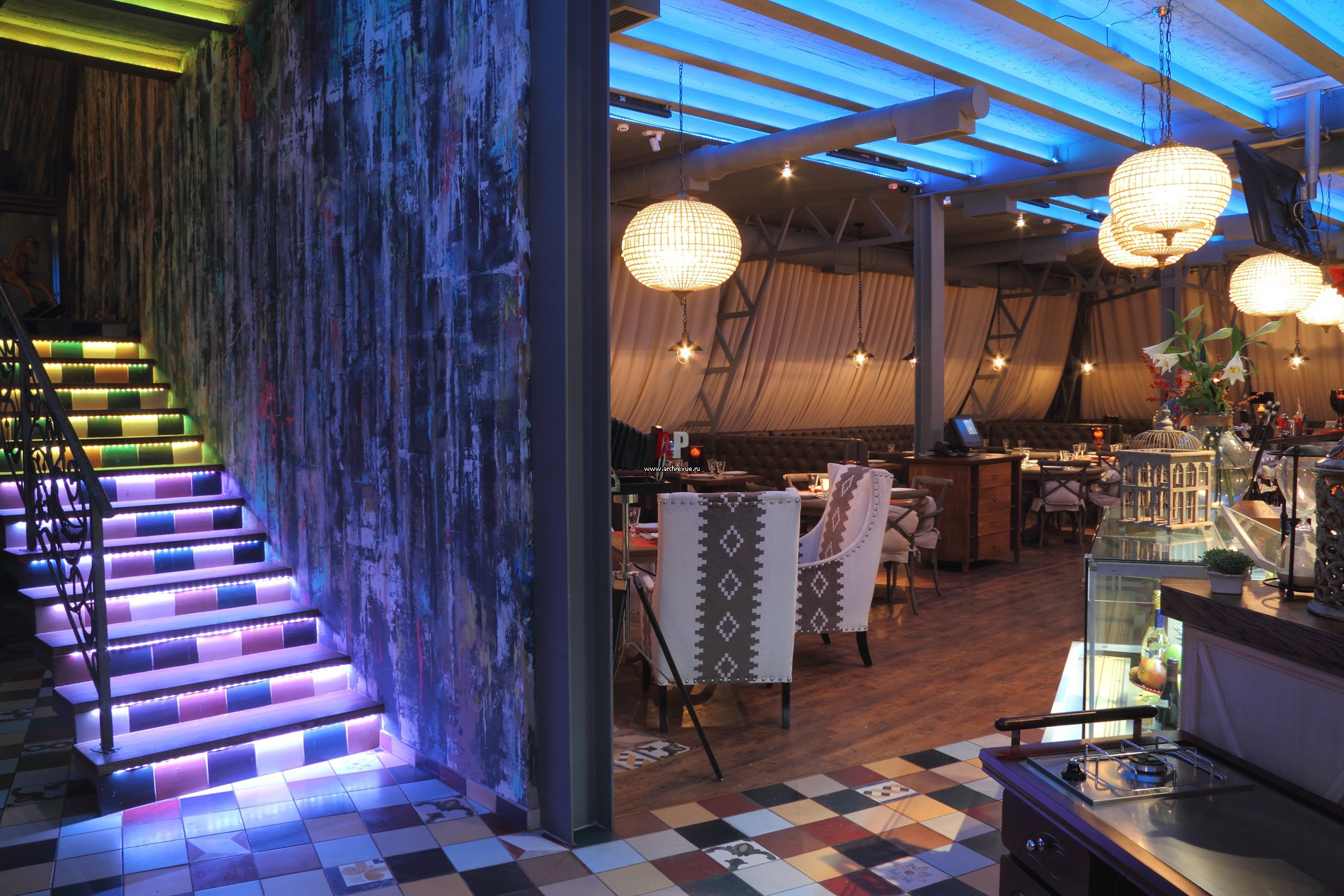 Лестница на второй этаж. Ступени с подсветкой. Пол первого этажа и подступенки облицованы этнической керамической плиткой природных оттенков.