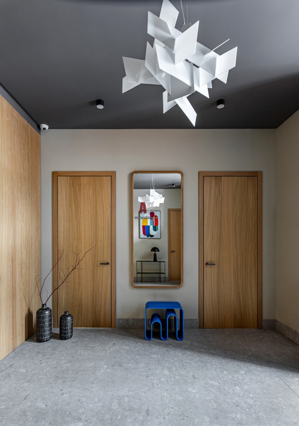 Прихожая. В зеркале между двумя дубовыми дверями отражается картина. Она вобрала в себя всю палитру жилого пространства, все оттенки в ней в разных сочетаниях появляются в каждом помещении. Необычный синий табурет изготовлен с помощью 3D-принтера.