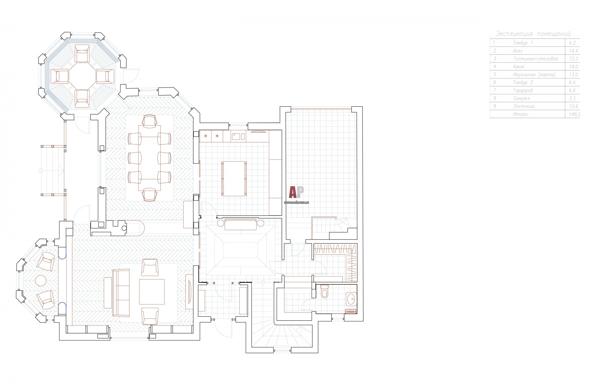 Планировка 1 этажа 3-х этажного семейного дома в эклектичном стиле.
