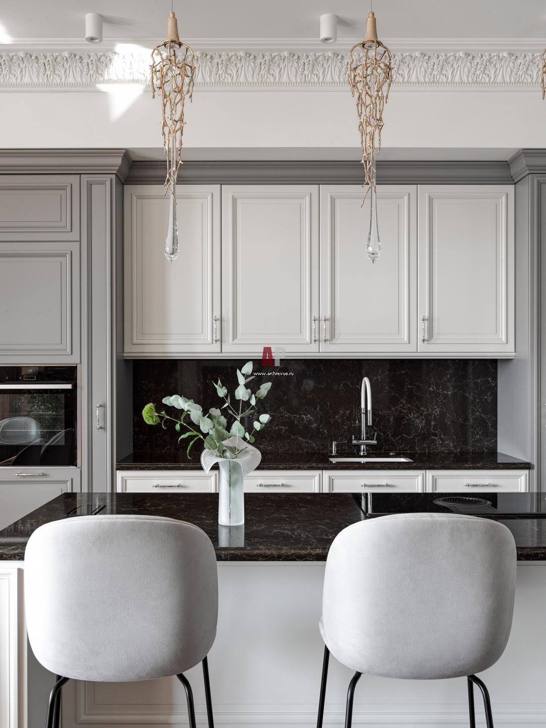 Черно-белая квартира в духе современной классики. Интерьер кухни.