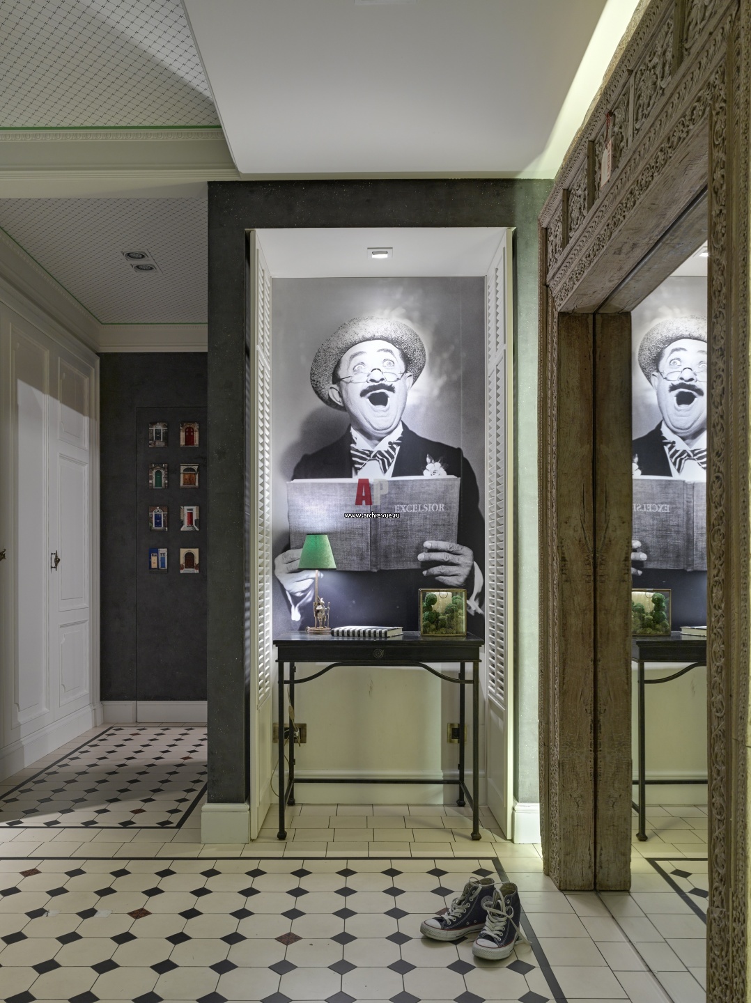 Интерьер прихожей. В антикварный портал дизайнер установила зеркало. Столик, Cote Table. Настольная лампа, Home Concept. На полу – метлахская плитка.