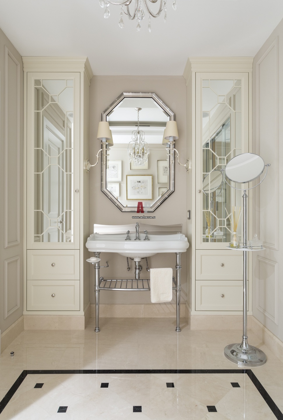 Ванная комната решена в теплой, сливочной цветовой гамме. Неоклассические шкафы с зеркальными вставками сделаны по эскизам автора проекта. Пол из мрамора Crema Marfil. Умывальник, Devon & Devon.