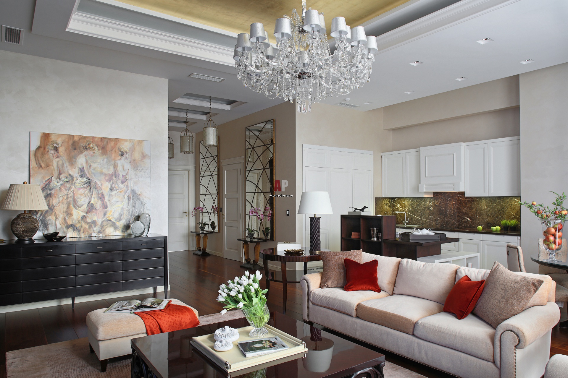 Зона кухни распложена в нише и воспринимается как продолжение общей гостиной. Белый кухонный гарнитур с островом, Castagna Cucine. Вертикальные модули с техникой встроены стену. Кухонный фартук и столешница выполнены из мрамора.