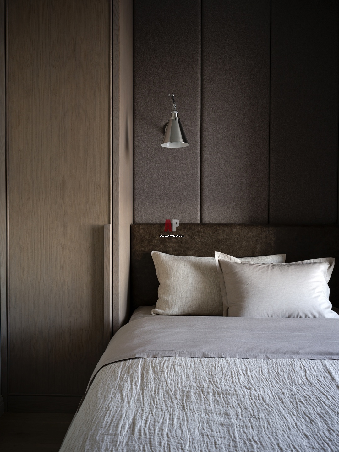 Современная квартира с теплой фактурой дерева. Мужская спальня.