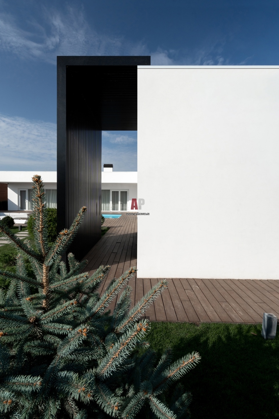 Стены дома сложены из керамических блоков, Poromax. Фасады отделены штукатуркой и панелями из термодревесины.