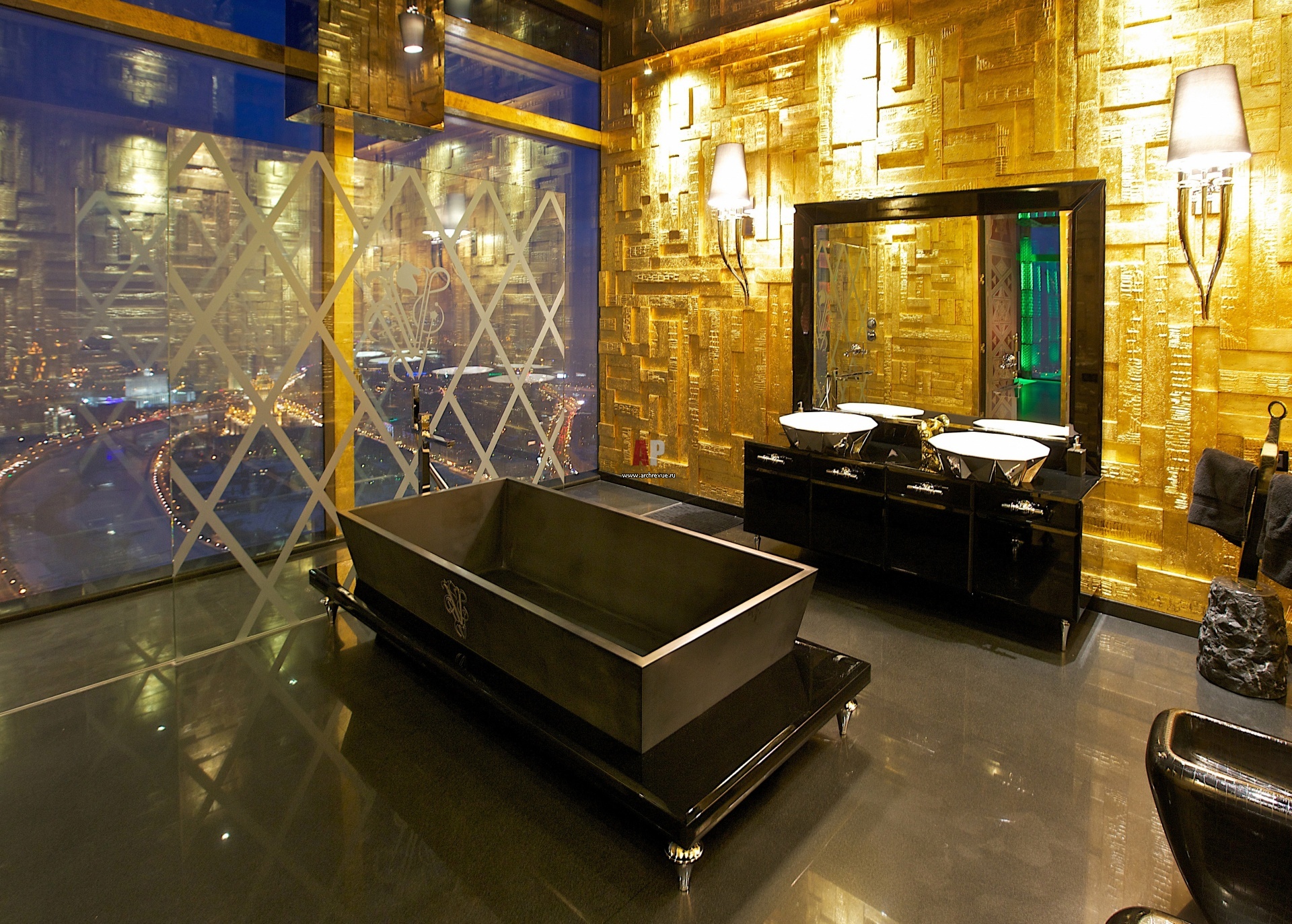 Стены в ванной комнате декорированы сусальным золотом. Мебель и сантехника, Visionnaire.