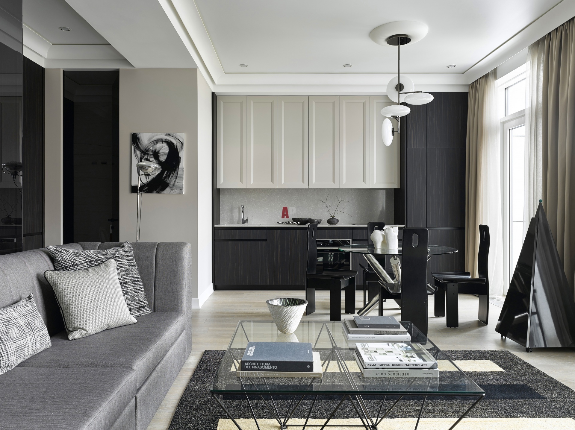 Монохромная квартира в клубном доме. Общая гостиная-кухня. Мебель винтажная или выполненная на заказ.