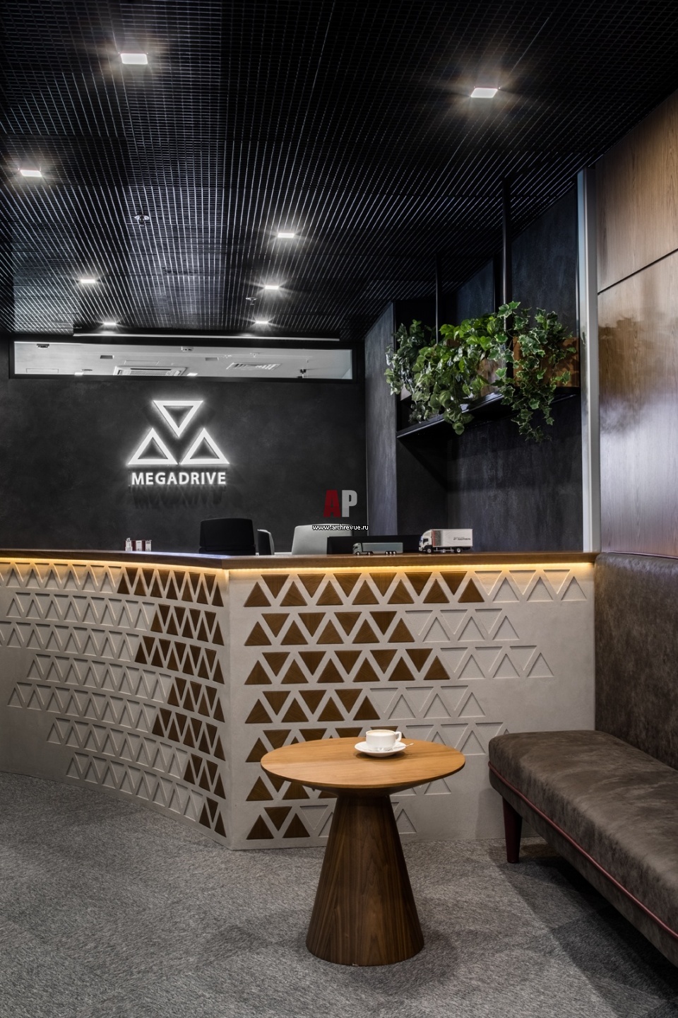 Зона респешен. Стойка имеет угловую радиусную конфигурацию, она выполнена из гнутой фанеры. Фасад оформлен декоративной штукатуркой под бетон и деревянными треугольниками в виде логотипа компании. Столешница с нижней подсветкой выполнена из дерева. Работы по дереву – компания Bionica Wood.