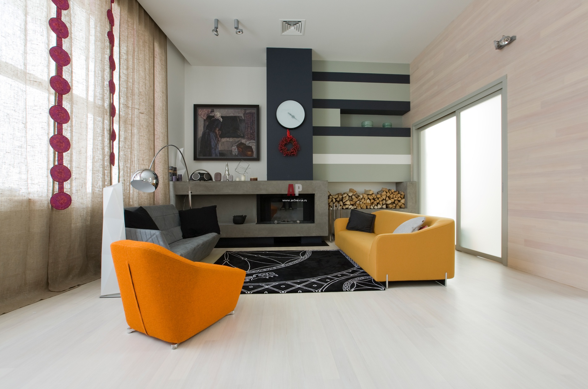 Визуальная доминанта гостиной – камин. Авторы проекта Петр Зайцев, Арсений Борисенко, архитектурное бюро za bor. Его портал и дымоход выполнены из бетона в стилистике минимализм. Рядом с топкой камина – поленница, полная дров.