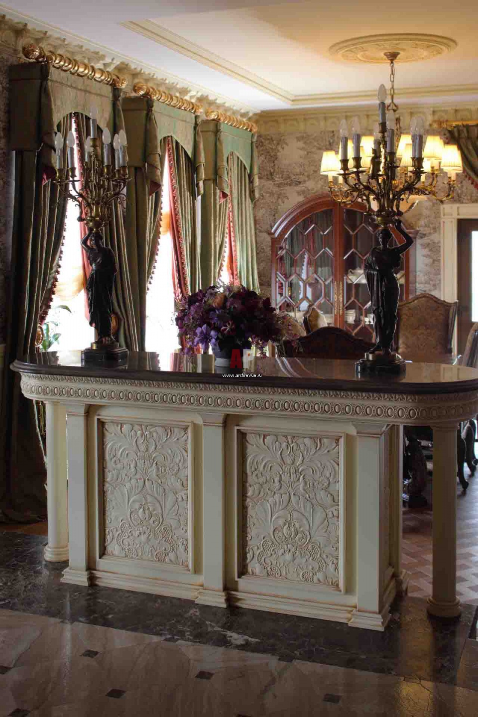 Декоративная тумба с каменной столешницей отделяет зону столовой от холла. Ее фасад оформлен линкрустой.