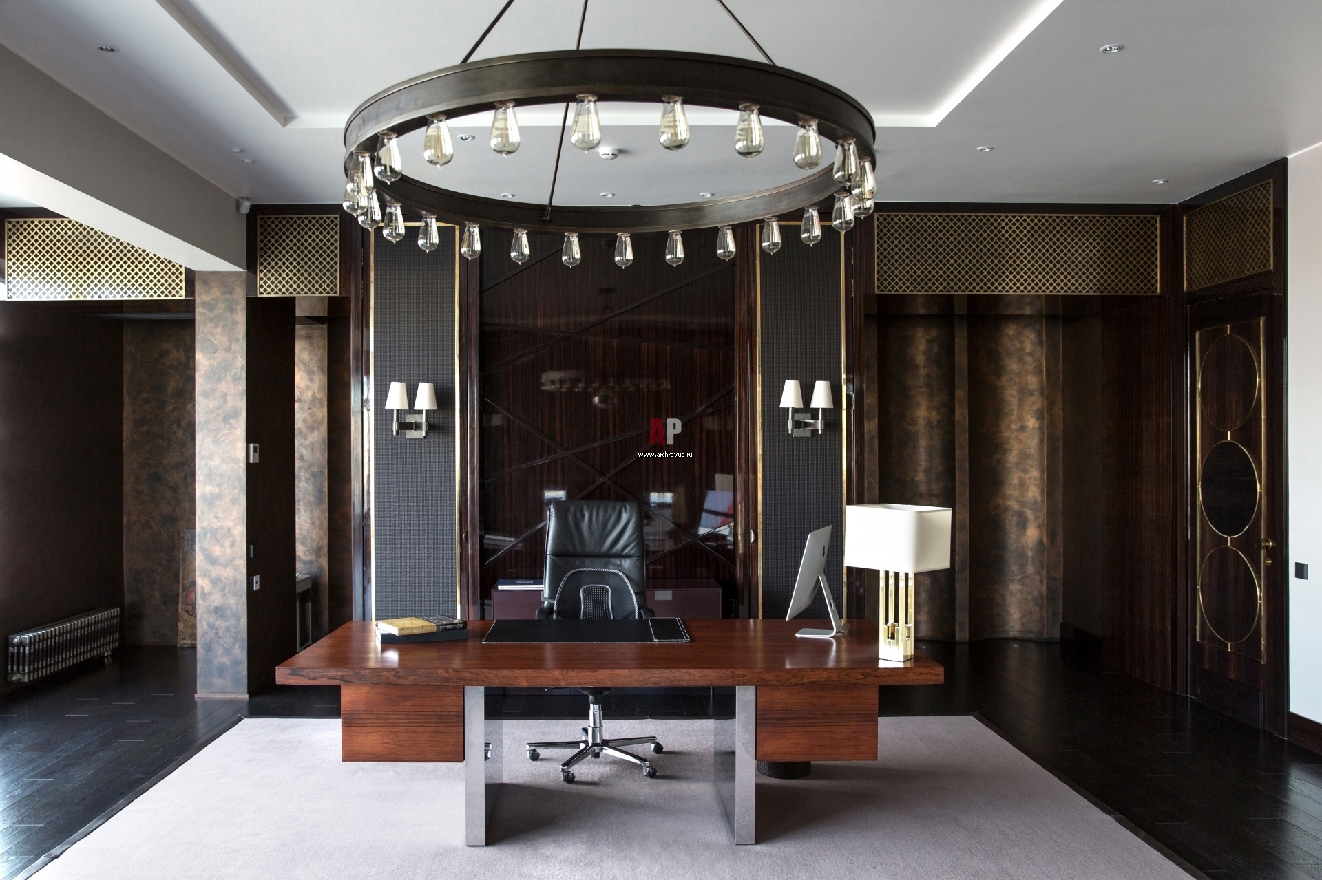 Стены за рабочим столом оформлены декоративной штукатуркой под бронзу и панелями из плетеной кожи. Стол руководителя с металлическим основанием и столешницей из палисандра, выполненной в форме крыла – винтаж, США, 1970-е гг. Лампа на столе также винтажная. Кресло руководителя, Walter Knoll. Центральный светильник, Ralph Lauren.