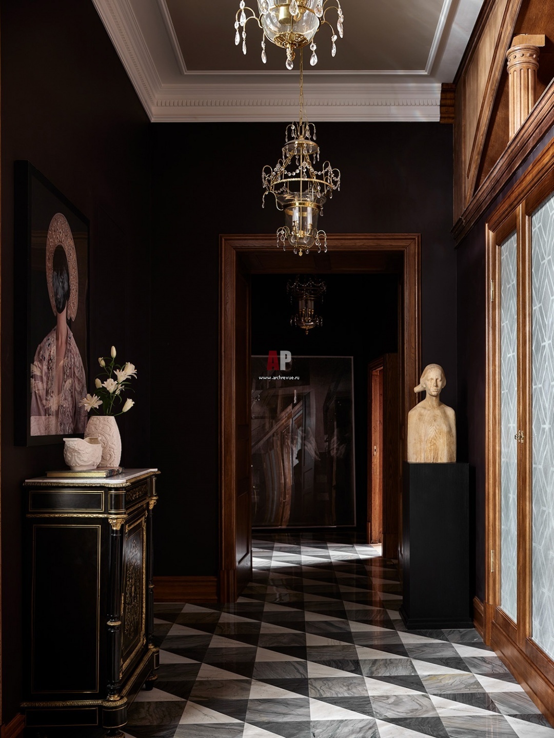 Холл. Живописная работа «Портрет Анны» художника-примитивиста Евгения Храменкова и деревянная скульптура «Она» Олега Шорова.