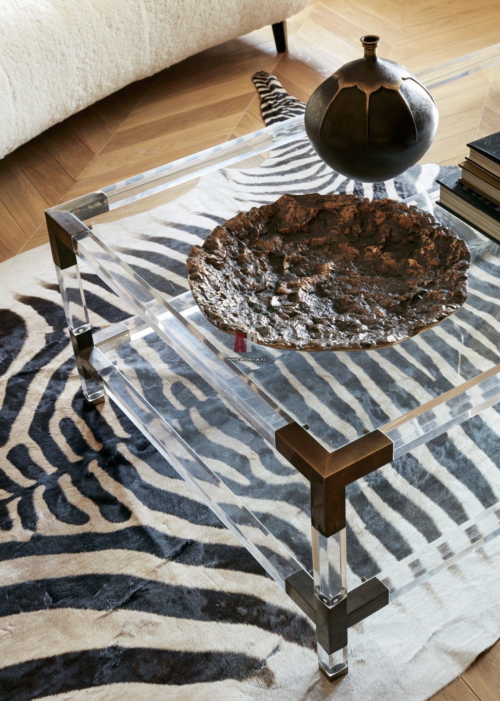 Ковер из меха зебры вносит динамику в почти монохромный интерьер.