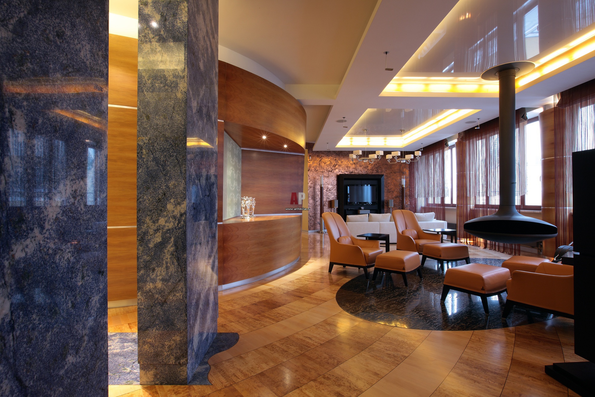 Гостиная в современном респектабельном стиле с элементами ар-деко. За радиусной стеной – санузел. Пилоны из синего камня создают условную границу между входной зоной и гостиной. Работы по камню, «Старк-Камень».