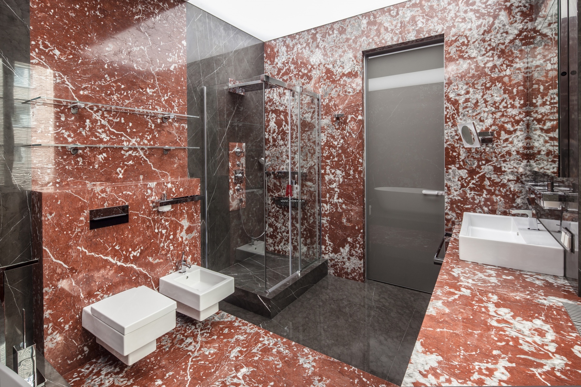 Интерьер главной ванной комнаты в отделке красным мрамором с динамичным рисунком.