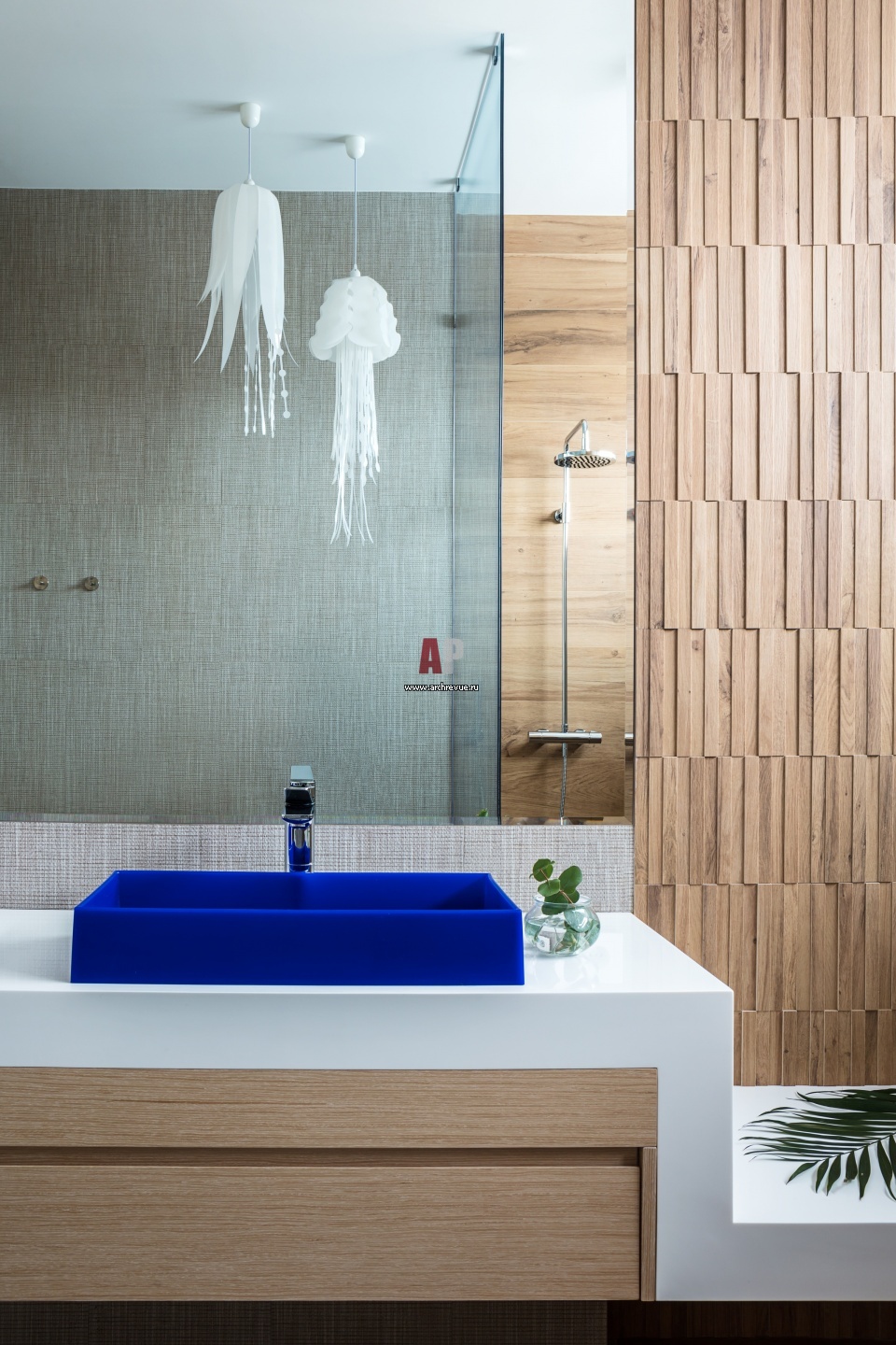 Стены детского санузла облицованы деревянной мозаикой с вертикальным рисунком. Синяя раковина Glass Design сделана из каучука, она мягкая.
