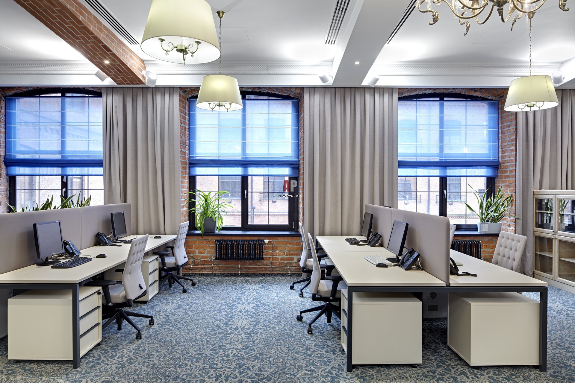 Фото интерьера рабочего open space в стиле лофт. Клинкерный кирпич, Feldhaus Klinker. Ковровая плитка размером 1Х1 метр с витиеватым рисунком задает дизайн-код рабочим зонам. К ней подобраны цвета римских штор, рабочих кресел и столешниц.