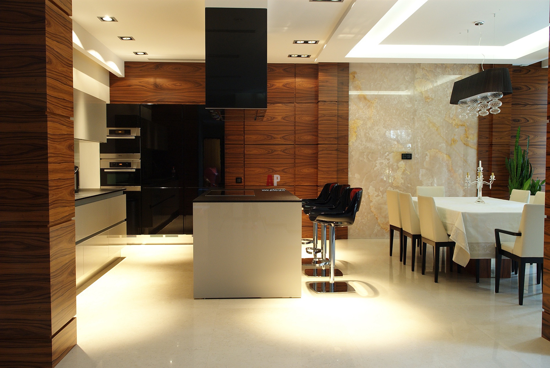 Кухня и столовая расположены в общем пространстве первого этажа, на небольшом подиуме. На полу – белый мрамор, на стенах – деревянные панели из палисандра сменяются слэбами из подсвеченного оникса. Кухня Binova.
