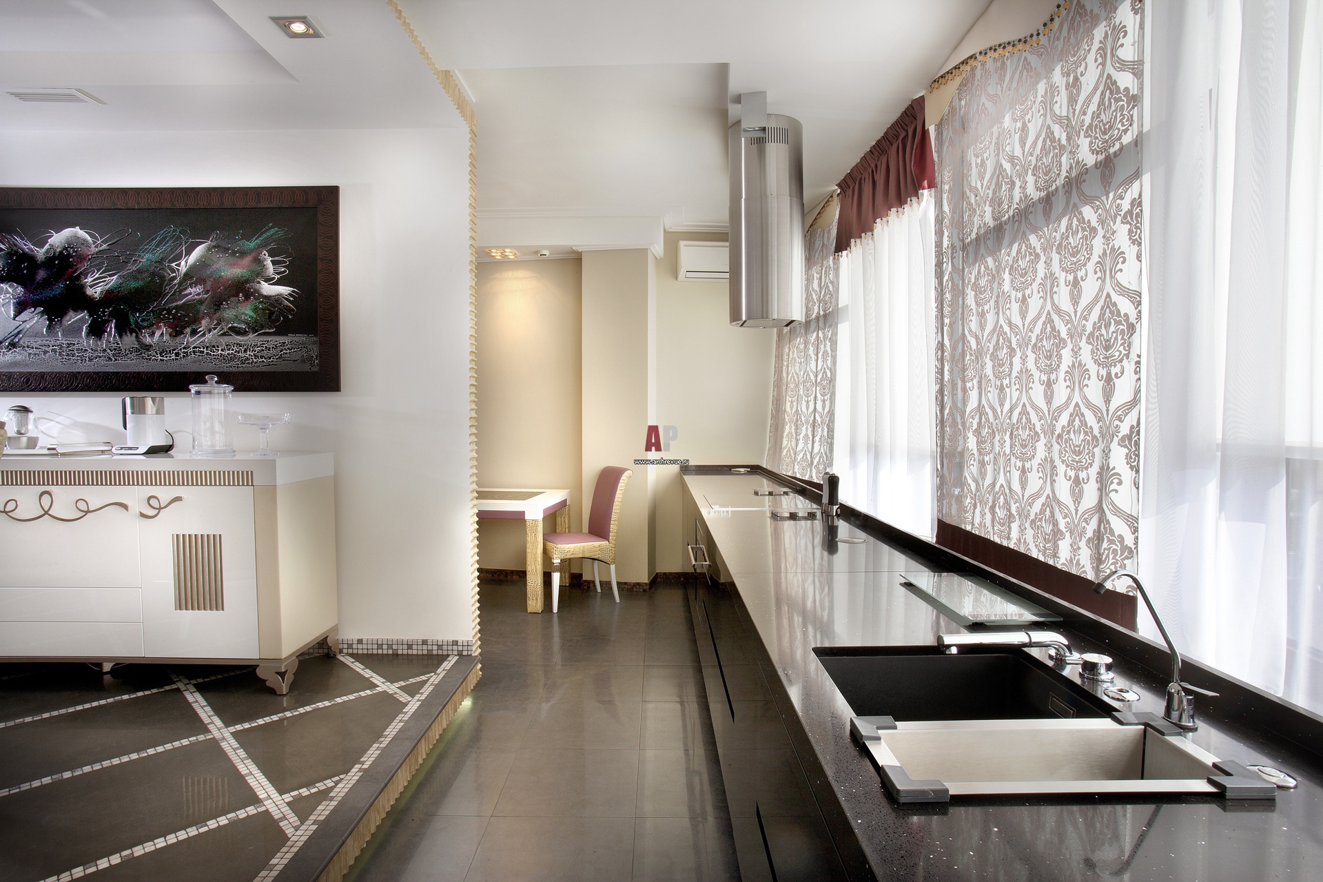 Кухня с рабочими поверхностями, мойкой и оборудованием расположена вдоль окна. Фасад кухонной мебели из черного лака. Вытяжка-цилиндр из хромированного металла.