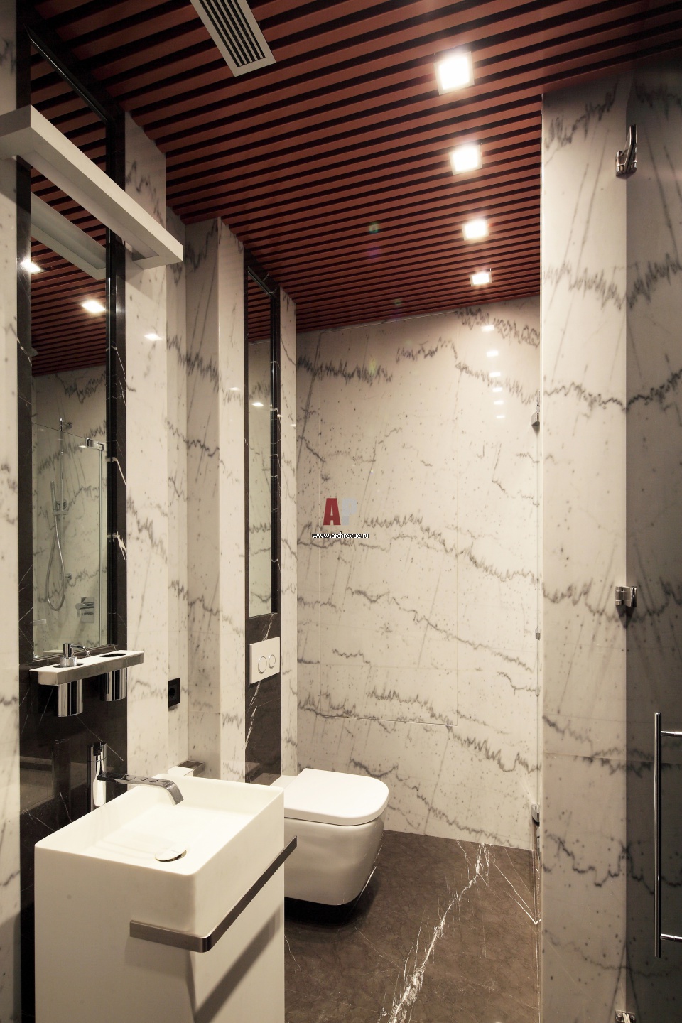 Интерьер гостевого санузла в отделке из серого с черными прожилками мрамора. Технический свет встроен в деревянный ячеистый потолок.