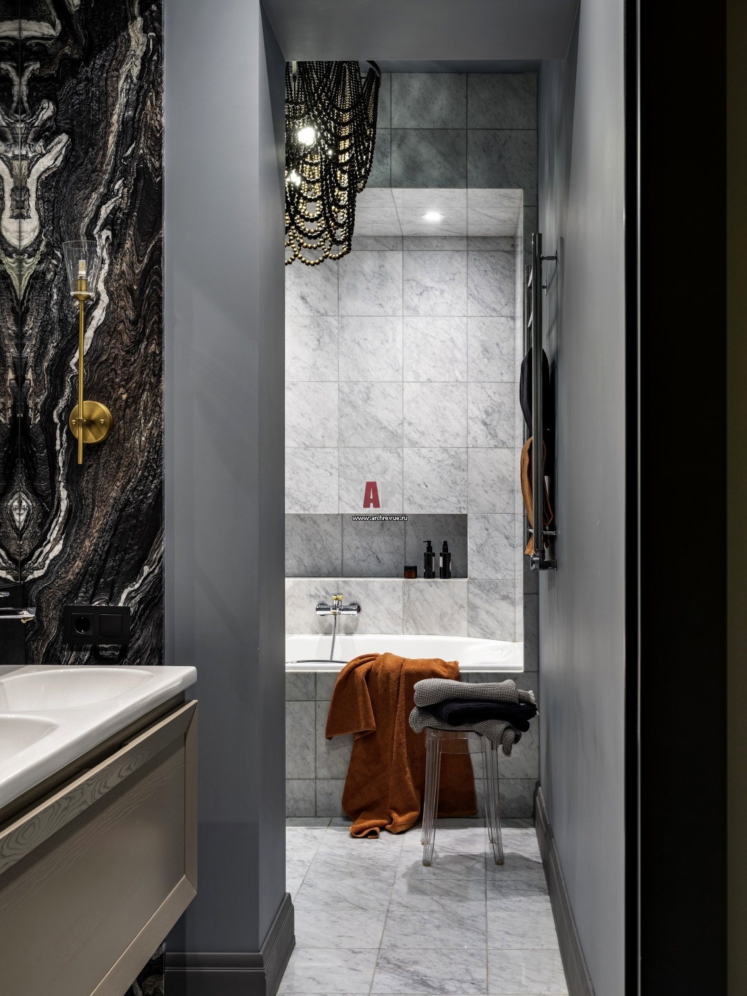 Историческая квартира в темной цветовой палитре. Интерьер ванной комнаты. Табурет из прозрачного пластика, Kartell. Черная каскадная люстра, винтаж.