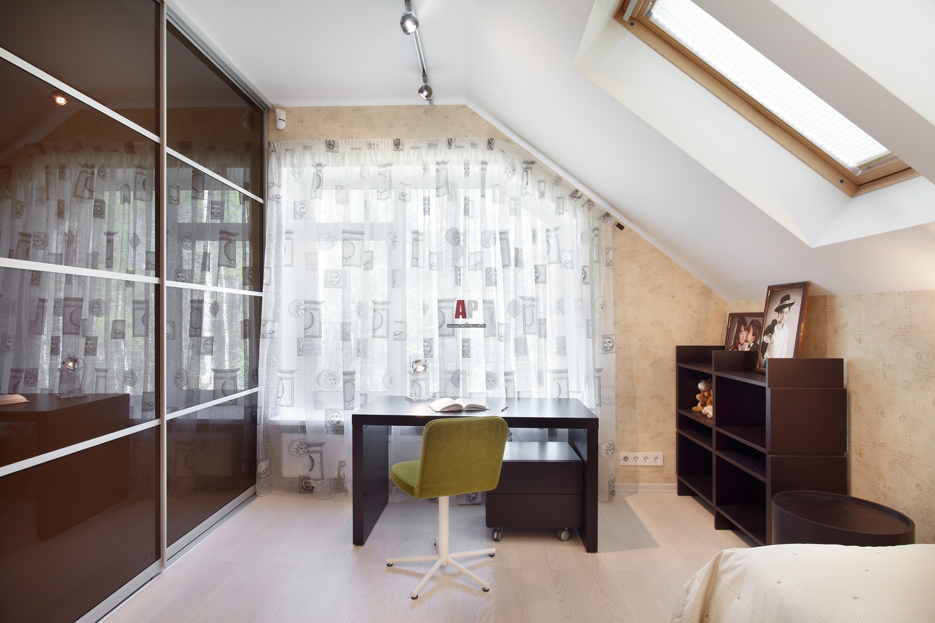 Фото интерьера зоны кабинета в комнате сына. Помещение оформлено строго, с использованием темного дерева.