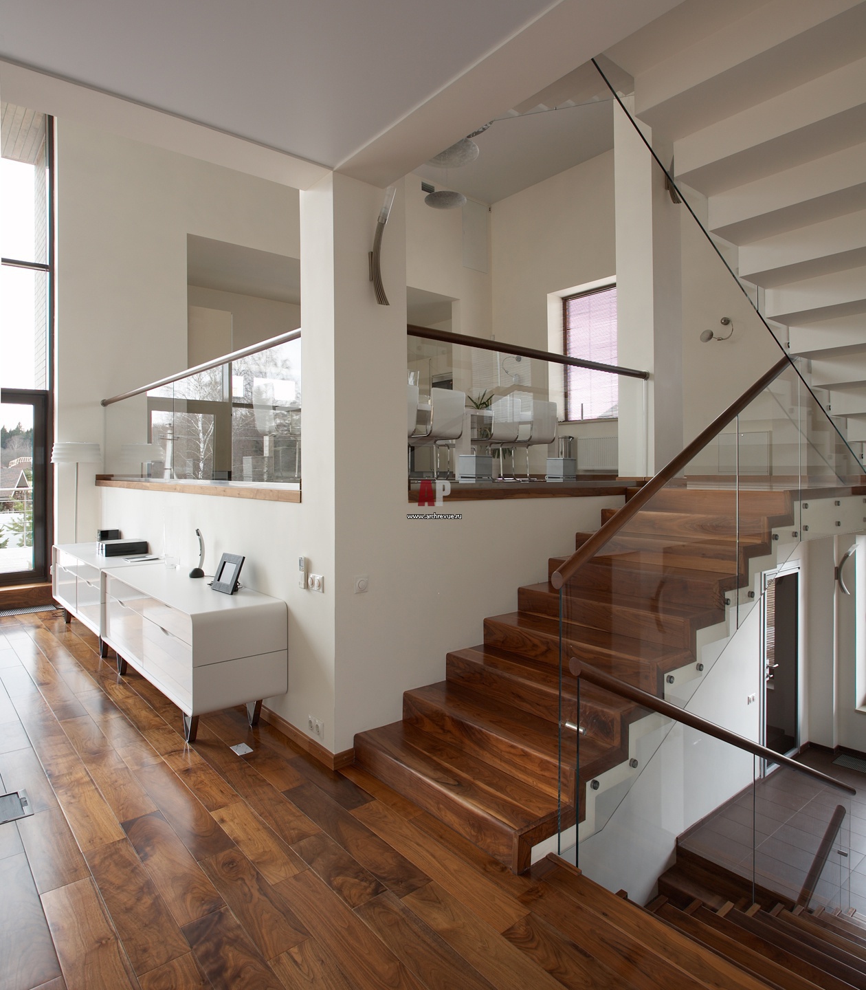 Столовая располагается на своего рода балконе, откуда открывается вид на объединенную зону гостиной, каминной и домашнего кинотеатра.