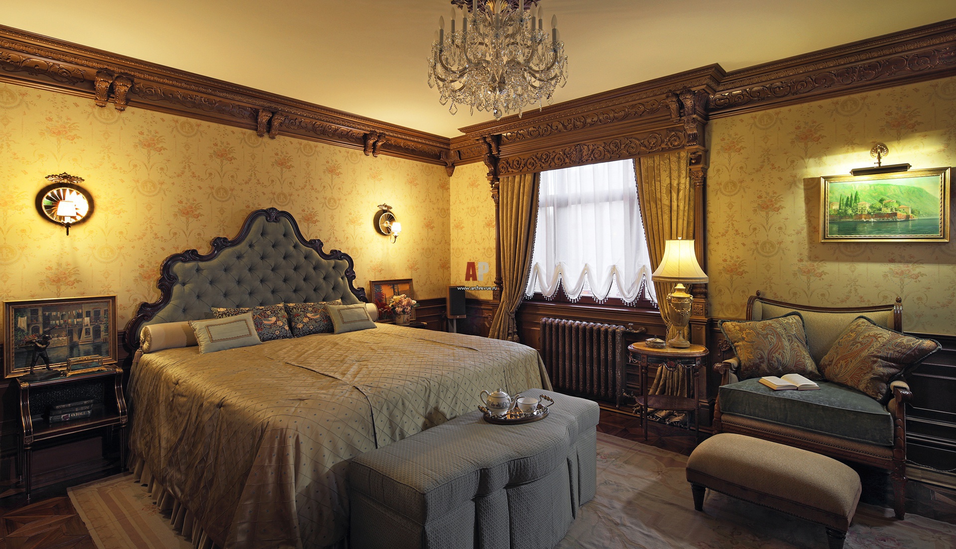 Рокайльные мотивы присутствуют и в интерьере главной спальни, темный дубовый карниз богато декорирован резным узором. Обои с классическим рисунком теплого светлого цвета. Кровать, кресла, прикроватные столики, Century Furniture– поставщик Charles.Cameron.