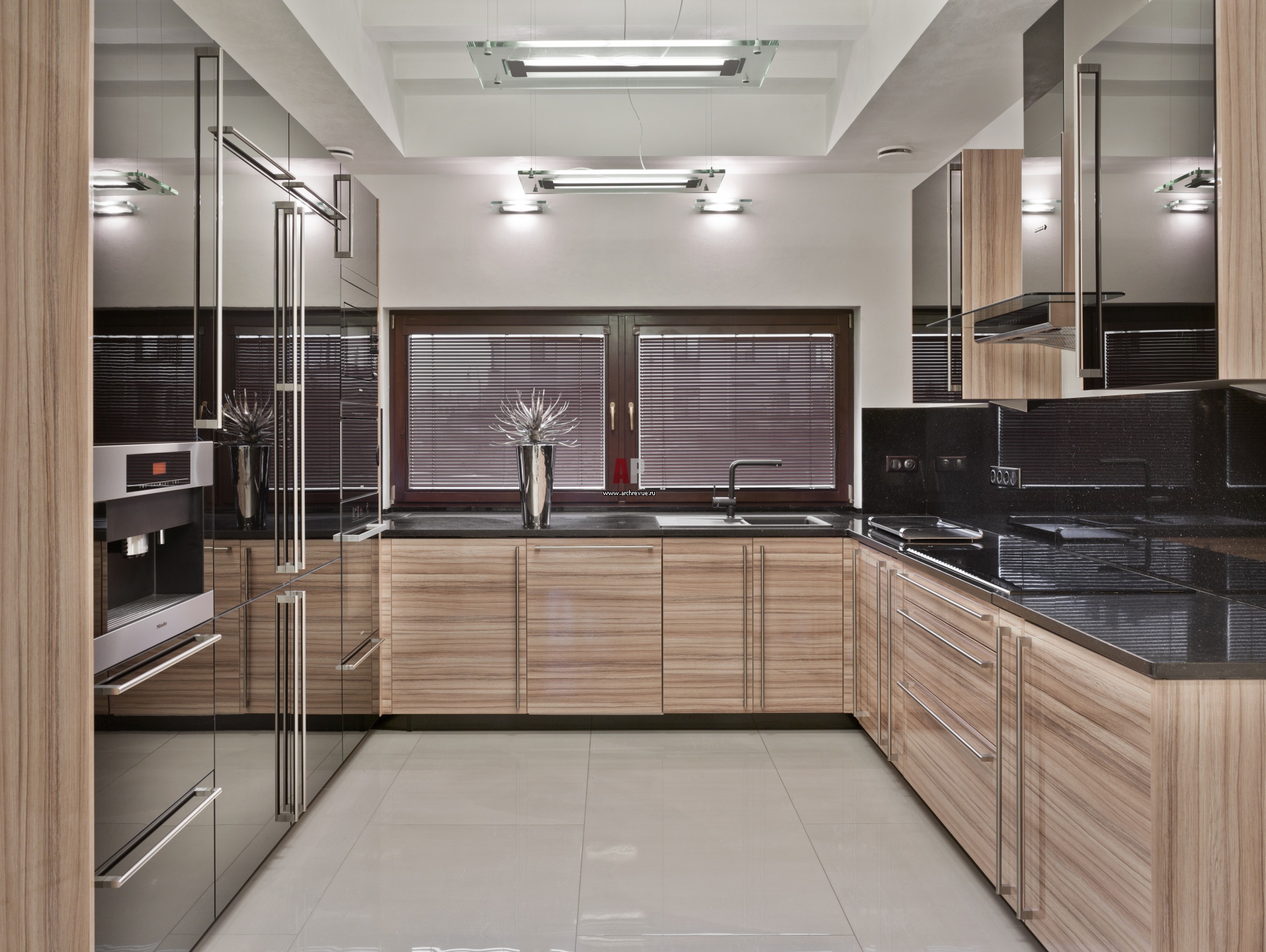 Кухня находится на месте бывшего гаража. Современные фасады кухонного гарнитура от Bauformat выполнены ы черном лаке и зебрано. На полу – керамогранит с фактурой разлитой по гладкой поверхности воды, поставщик BARS RED.