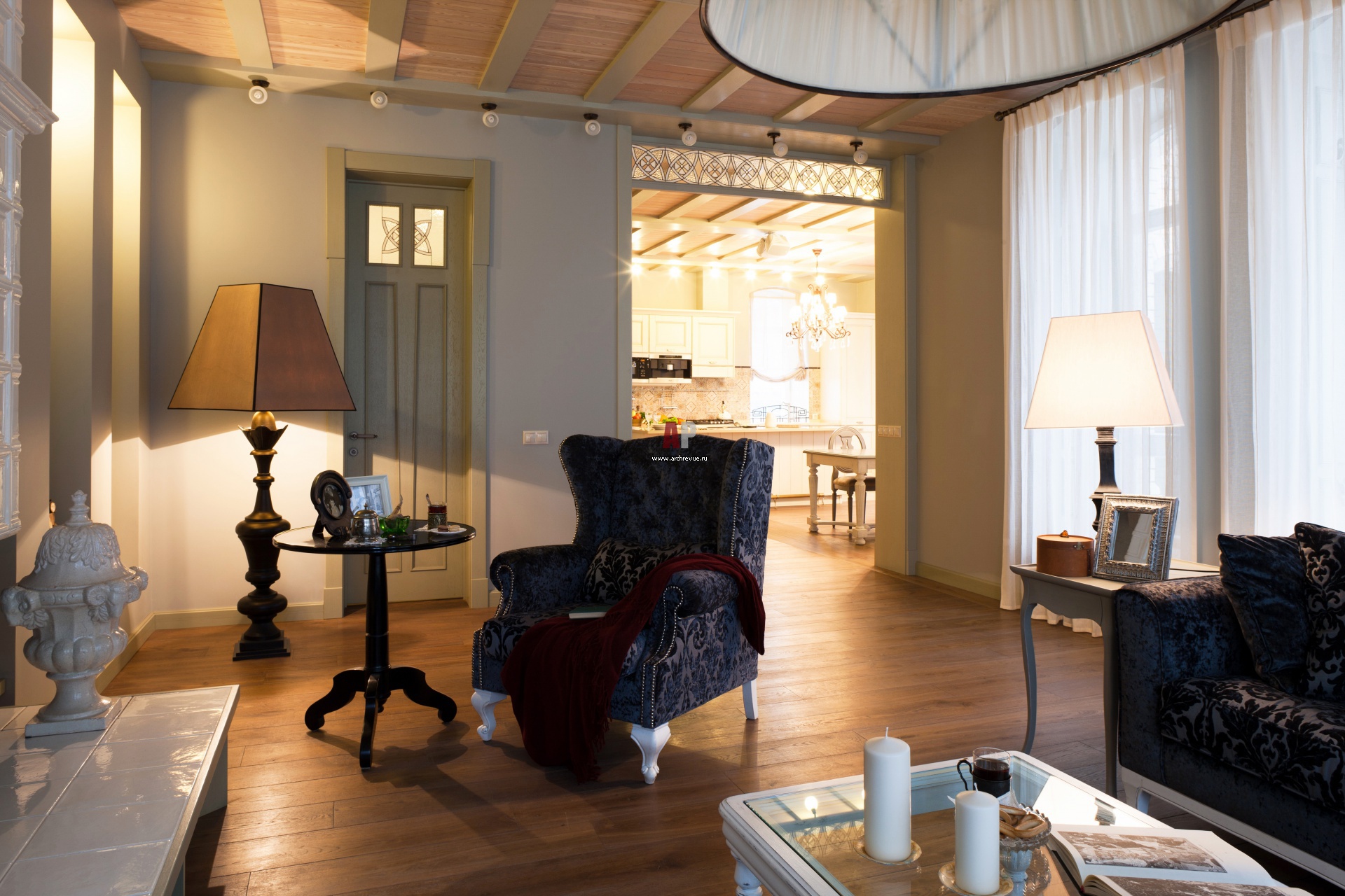 Интерьер гостиной с открытым проемом на кухню. В интерьере объединена эстетика старинной подмосковной дачи и стиля прованс.