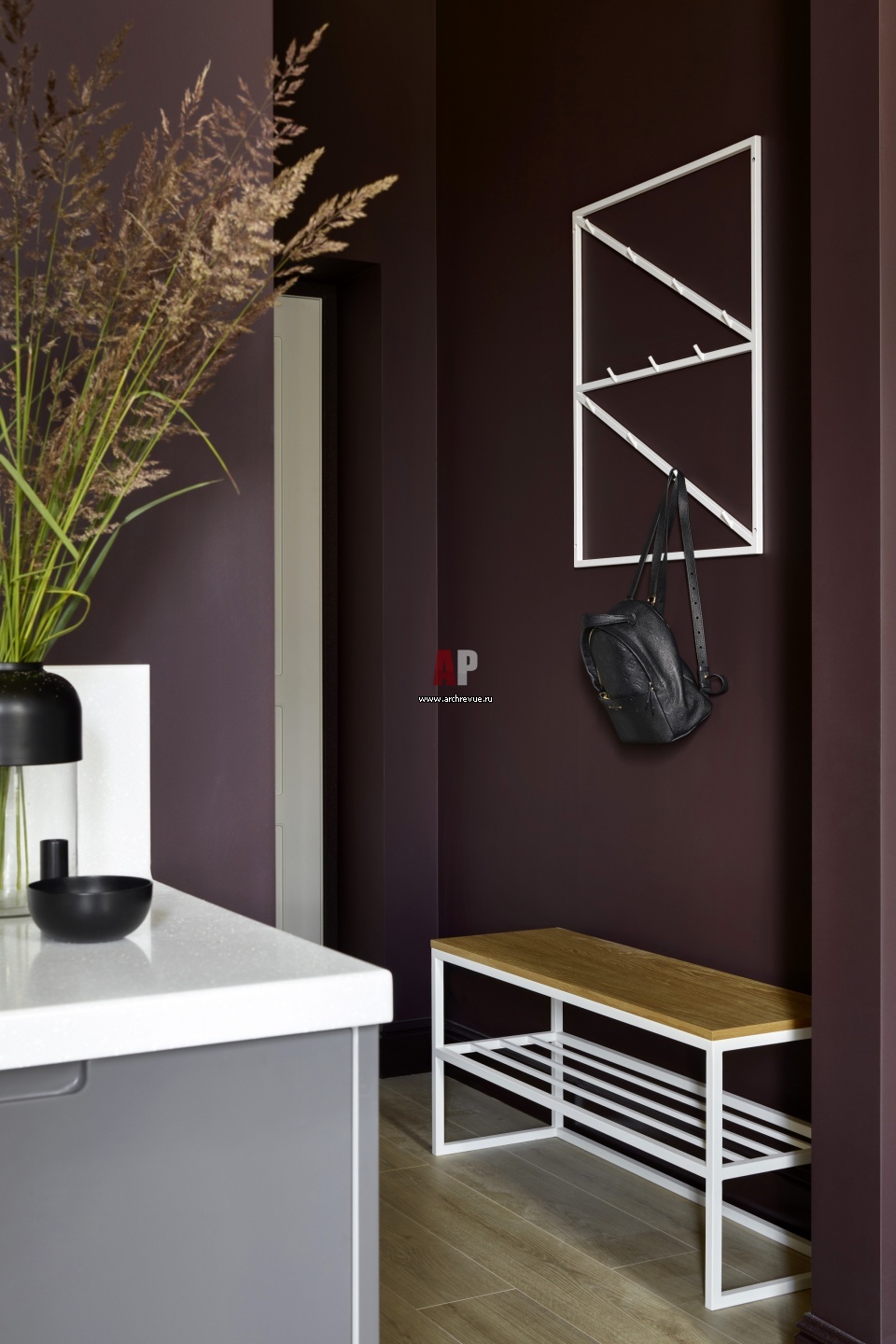 Небольшая однокомнатная квартира для девушки. Интерьер прихожей. Скамья и вешалка на стене, Intelligent Design.