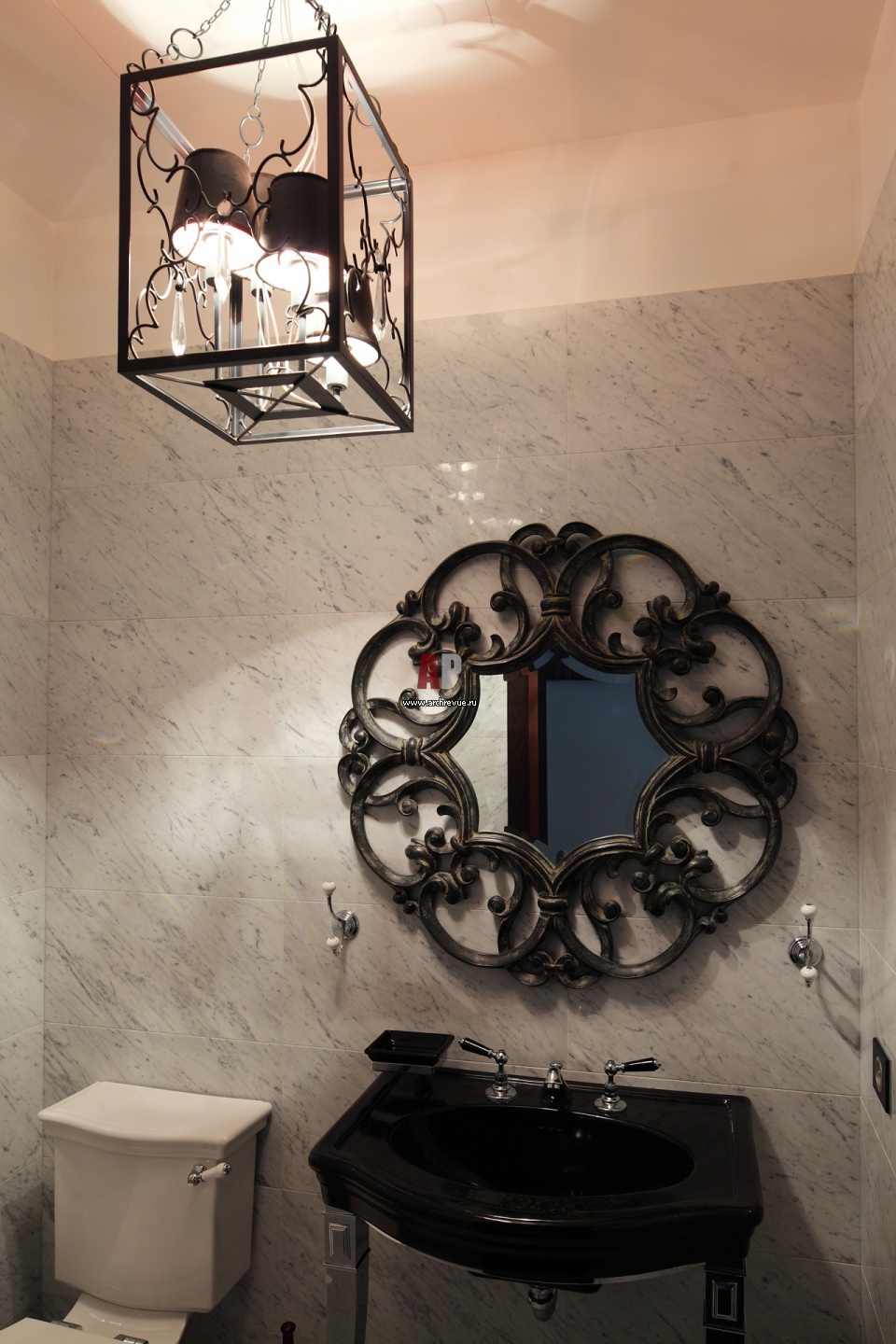 Интерьер гостевой ванной комнаты с элементами неоклассики. Зеркало в ажурной раме из темного дерева.