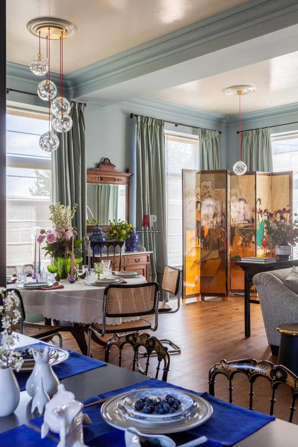 Общая гостиная. Антикварная коллекция посуды дополнена современными изделиями художника по росписи посуды Флеры Даминовой и мастеров Гусевского хрустального завода.
