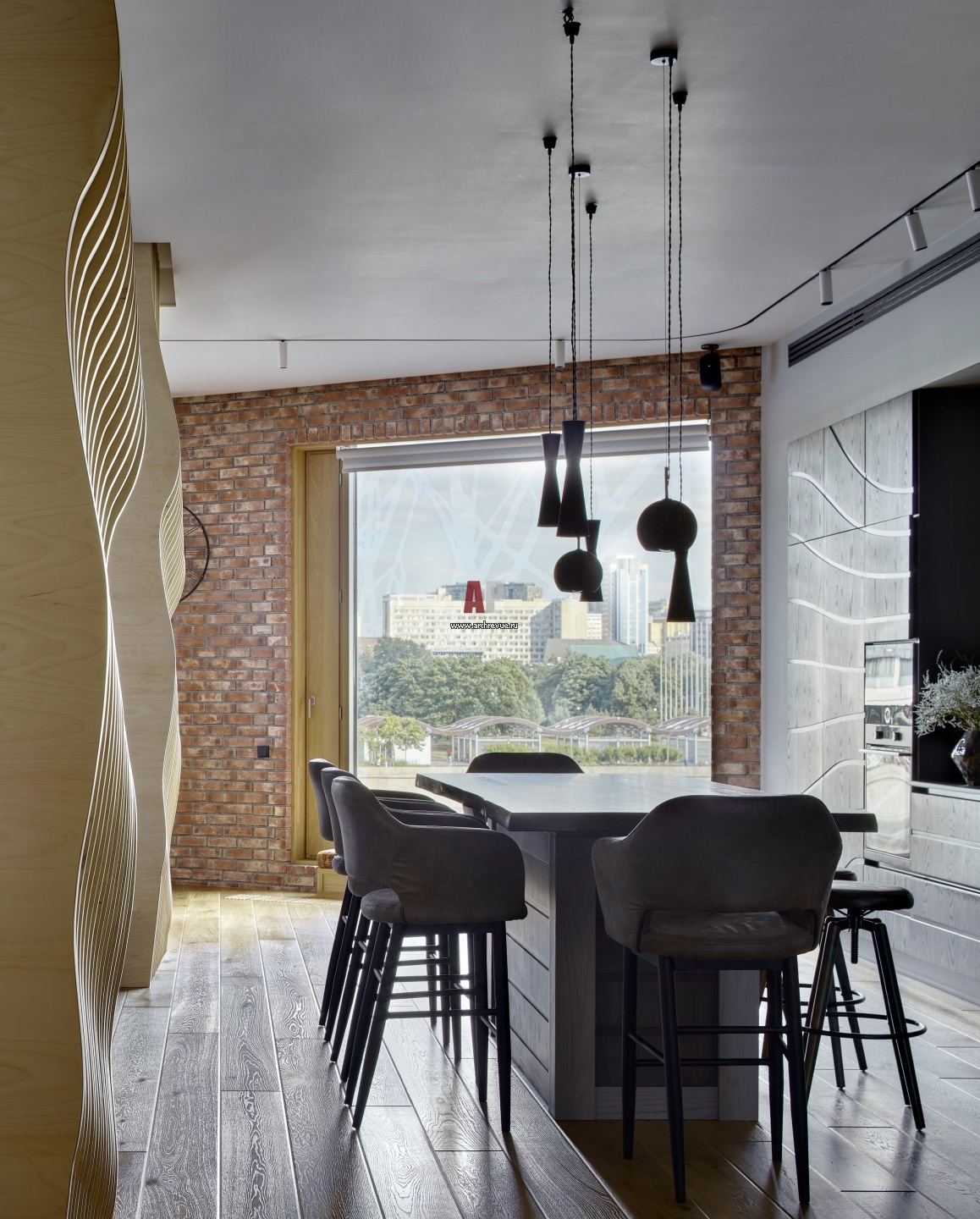 Зона кухни-столовой отделена от гостиной с помощью двухсторонних перегородок-стеллажей из параметрической фанеры. Тема волн в интерьере рифмуется с видами на Москву-реку из панорамных окон.