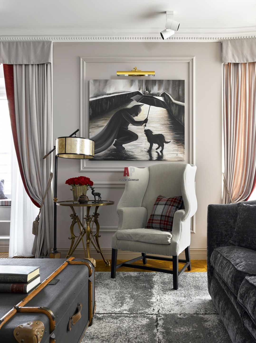 Интерьер гостиной решен на контрасте светлых стен, темно-серой и черной мебели и красного текстиля. Окна оформлены шторами двух цветов – верхняя, светлая, совпадает с цветом стен, нижняя имеет насыщенный алый оттенок.