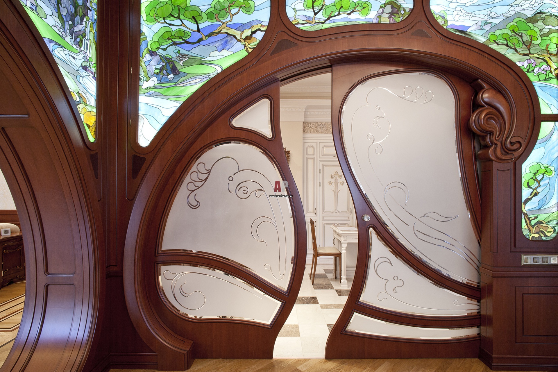 Вид на кухню через портал в стиле модерн. Обтекаемых форм портал резьбой выполнен из тонированной вишни, с темным деревом гармонируют яркие сине-зеленые витражи.