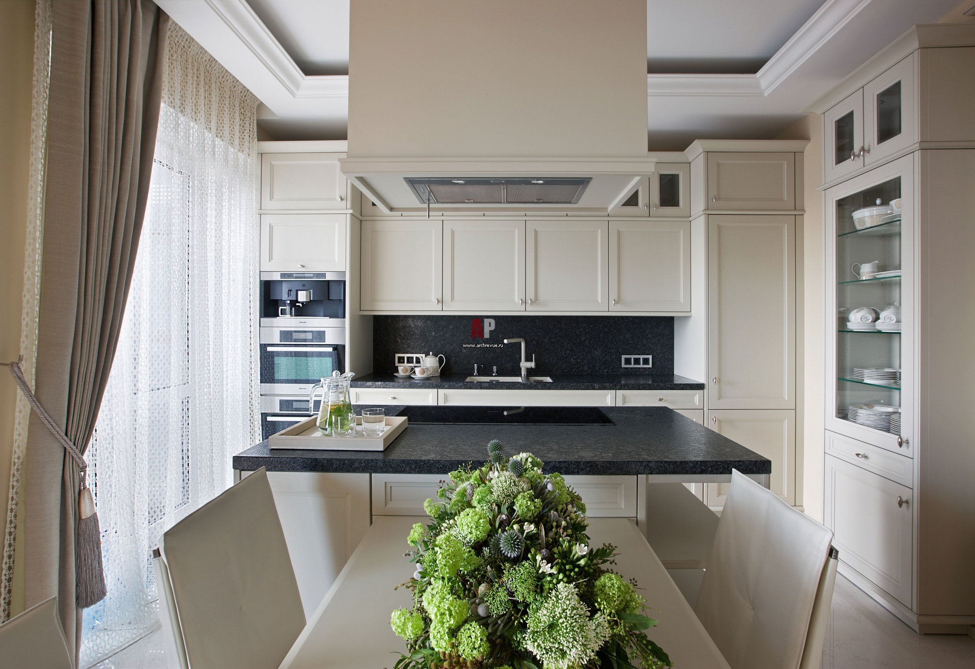 Интерьер кухни-столовой квартиры в духе современной роскоши. Кухня, SieMatic. Стулья, Poltrona Frau. Столешницы выполнены из черного камня.