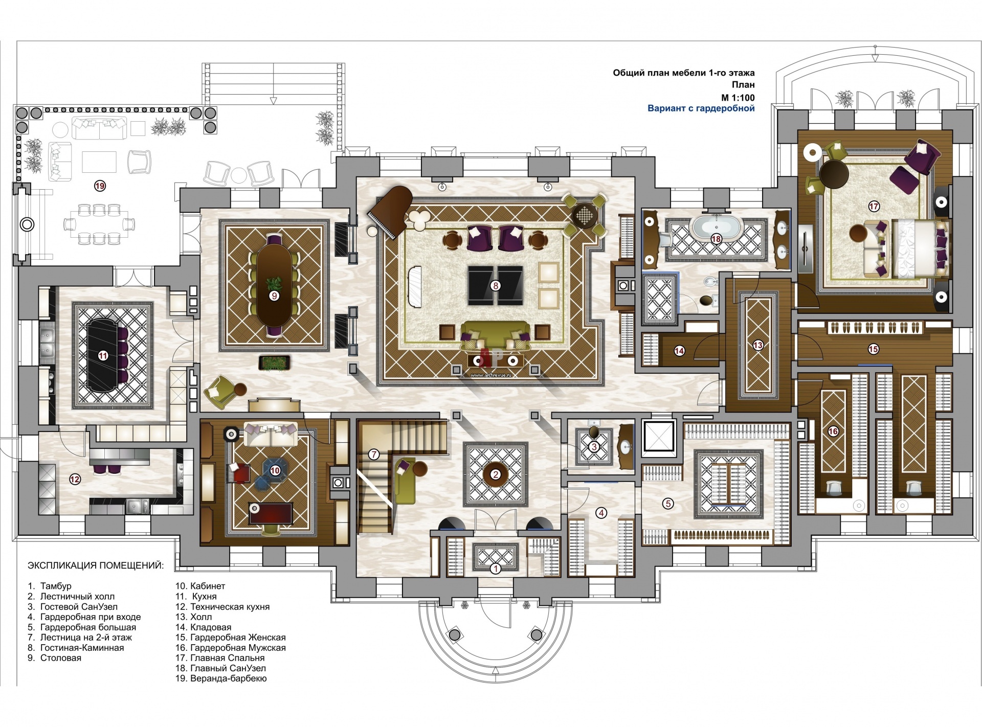 Планировка 1 этажа 4-х этажной семейной резиденции. Общая площадь – 2000 кв. м.