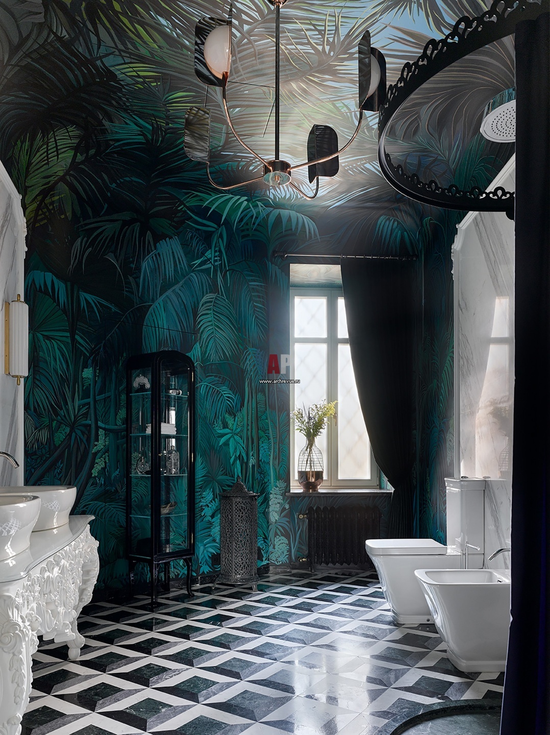 Стены и потолок в ванной комнате оформлены художественной росписью. В основе ее сюжета – мотив джунглей с работ Анри Руссо. Темные, сочные цвета создают эффект живых джунглей и скрывают неправильные углы примыкания стен, а также дверь хозяйственных помещений.