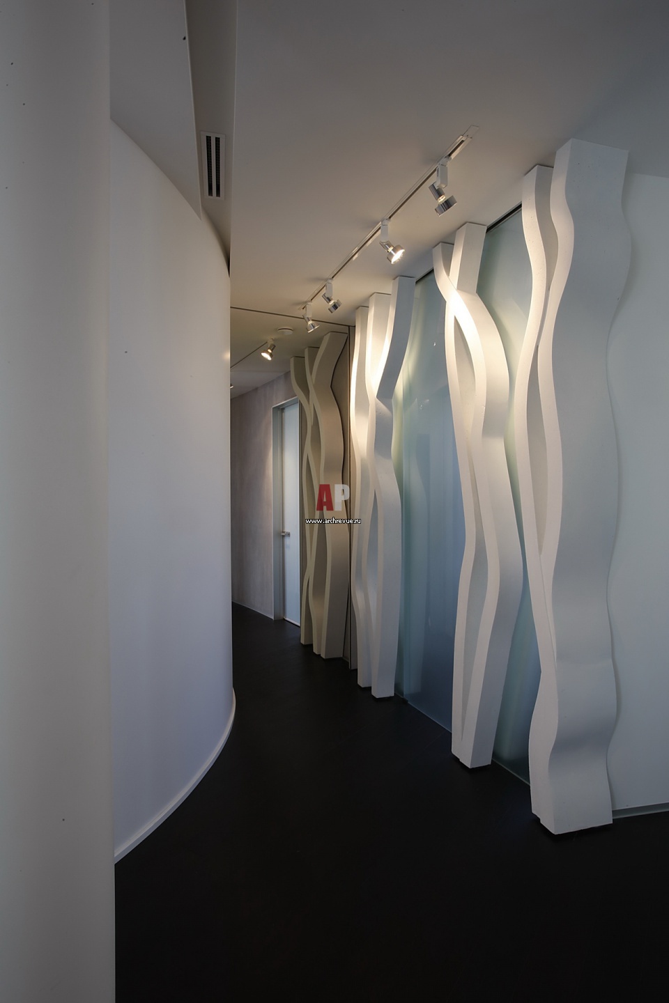 Радиусный коридор разделяет квартиру на гостевую и приватную часть. Стена декорирована скульптурными объектами из бетона, напоминающими деревья.