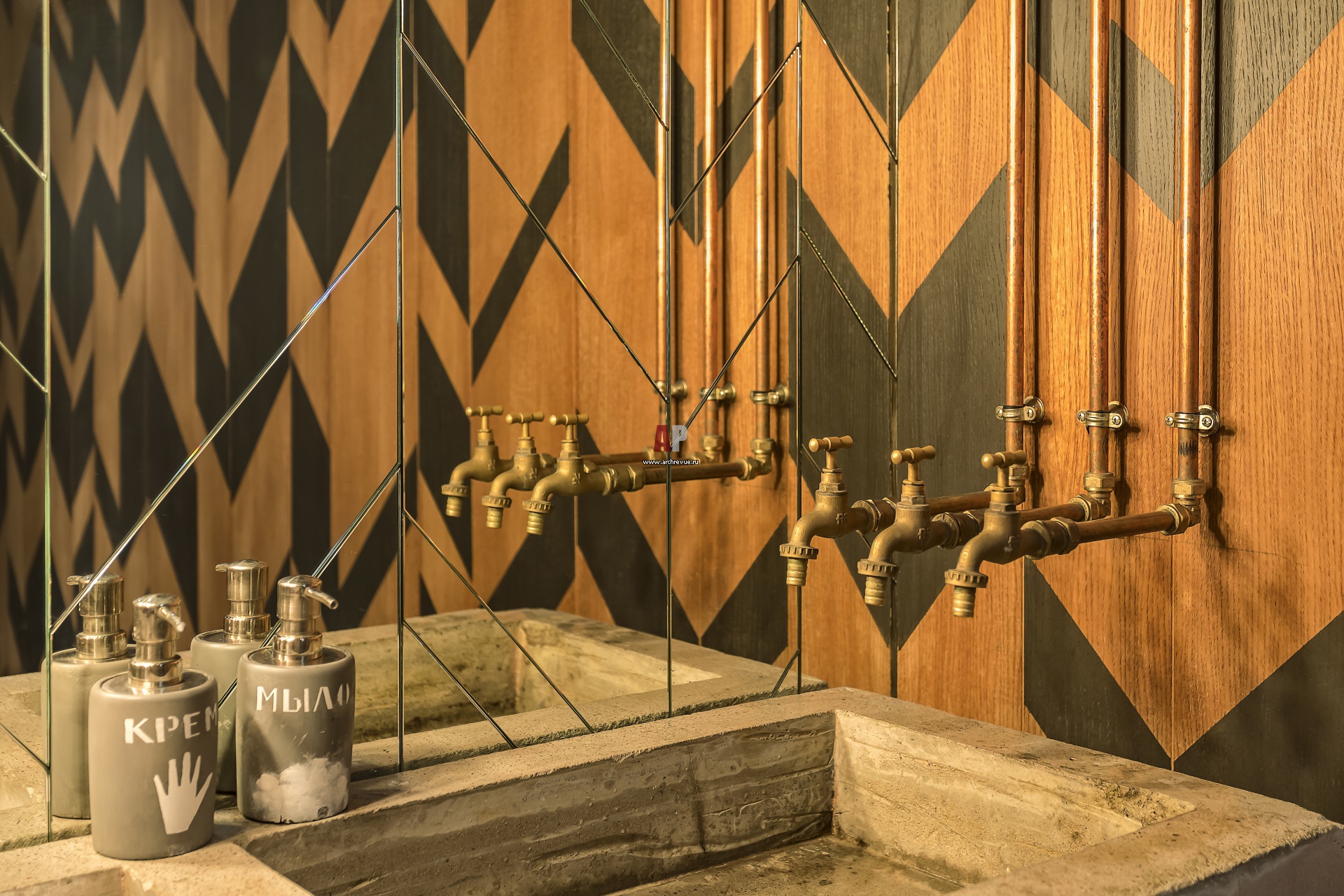 Интерьер туалетной комнаты в ресторане. Трубы и кран имитируют аналогичные в старом советском доме.