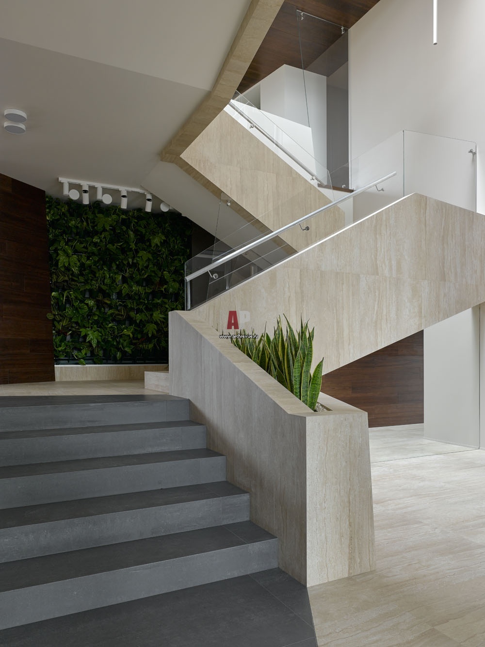 Центральный элемент пространства – скульптурная лестница из монолитного бетона с облицовкой натуральным итальянским керамогранитом и ониксом выглядит брутально и элегантно одновременно.