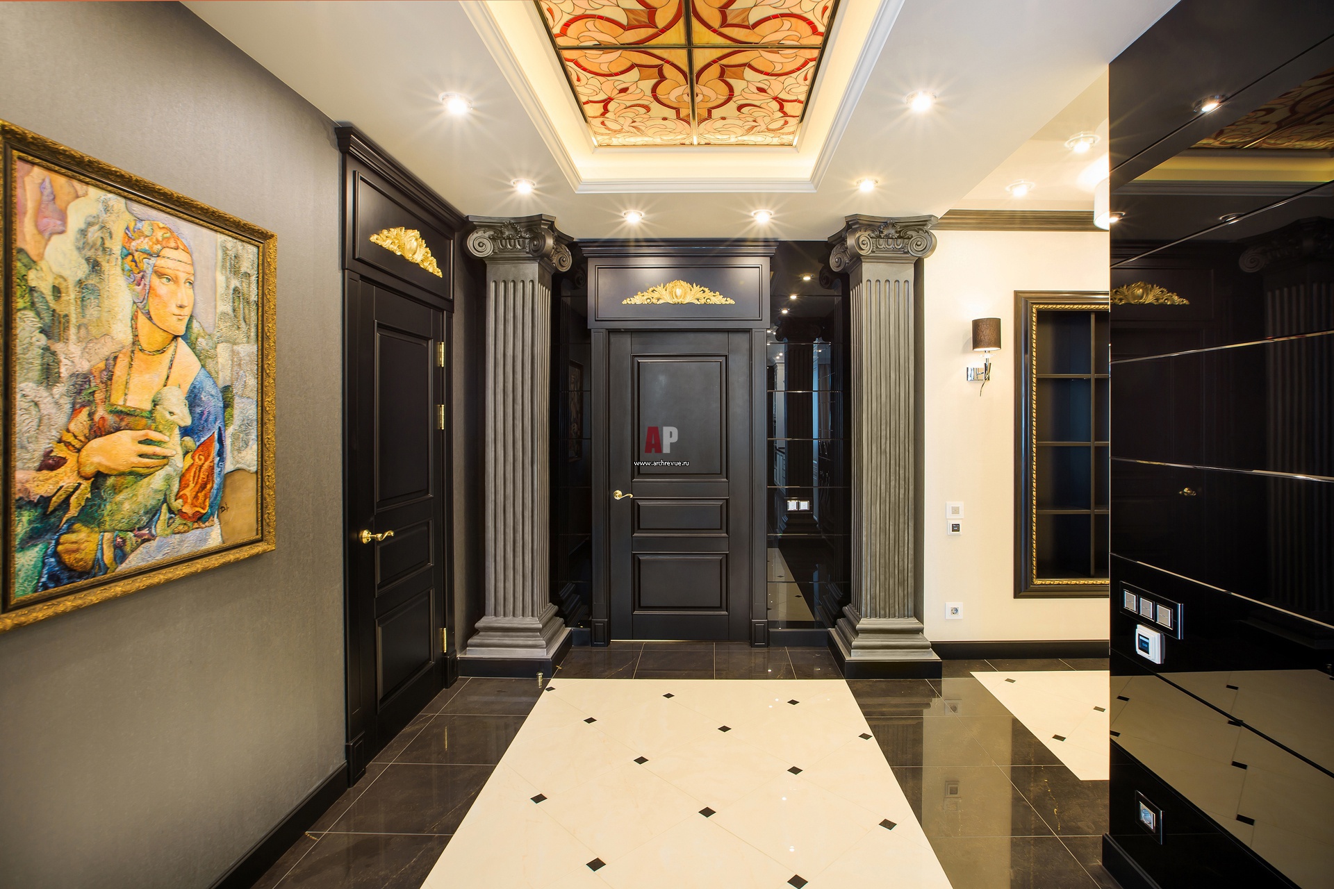 На фото – интерьер парадного холла. Трехметровую высоту потолков подчеркивают античные полуколонны, а также потолочный витраж – художественное изделие из стекла оттенков янтаря.