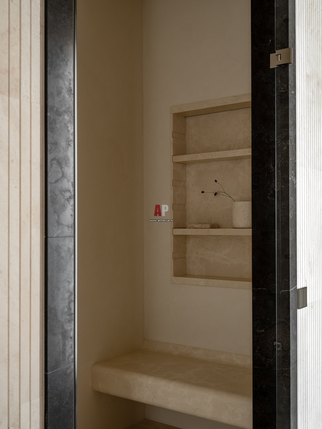 Женский интерьер с тактильными отделками и иконами мебельного дизайна. Ванная комната при спальне. Душевая отделана камнем.