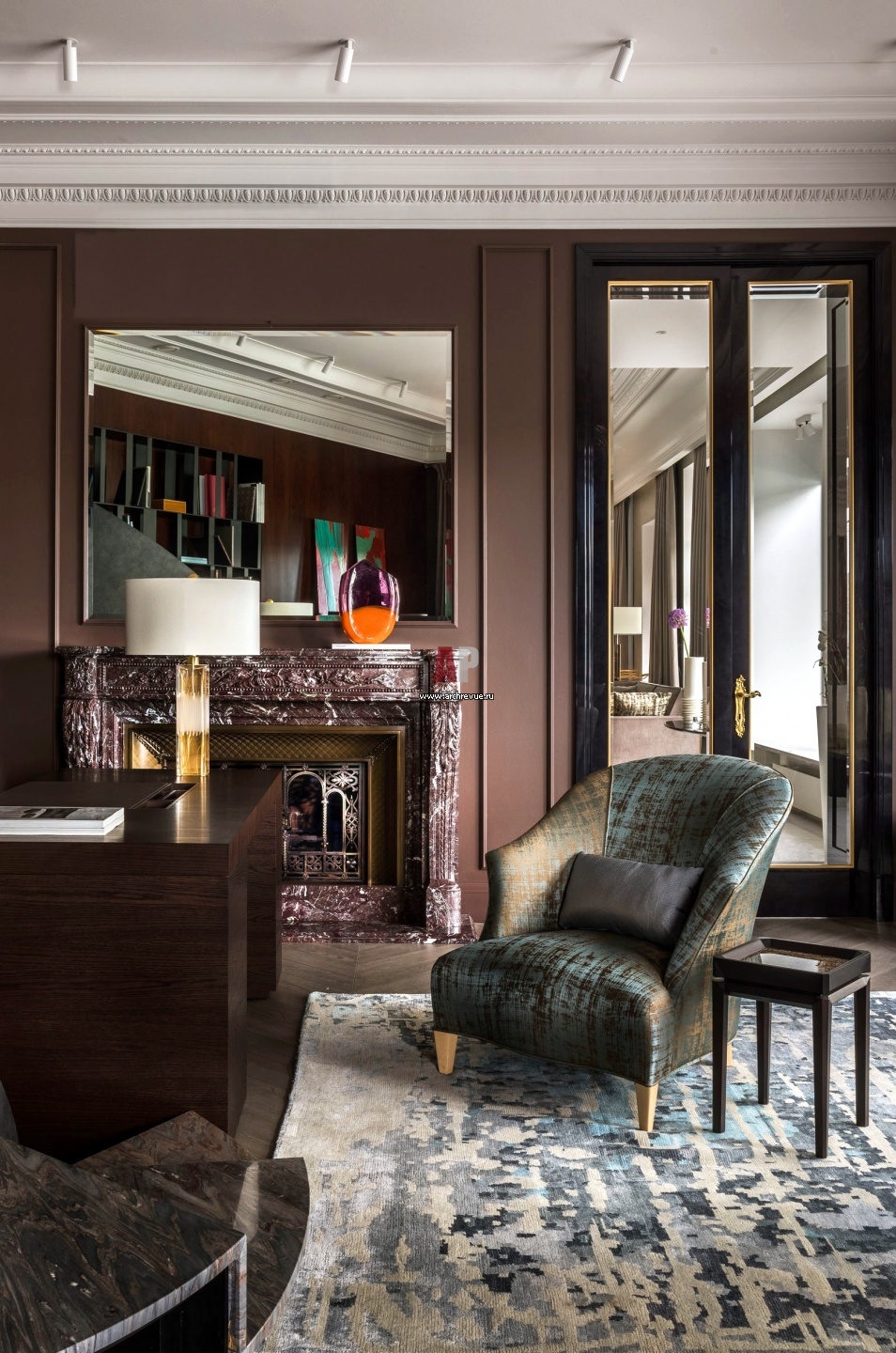 Каминная зона в кабинете. По обе стороны от камина – раздвижные двери из эбенового дерева с зеркалами. Они ведут в гостиную.